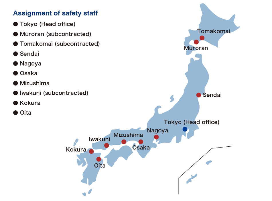 We perform safety management activities to ensure the 143 chartered ships that are the backbone of our business operate safely. We have specialist staff equipped with experience as captains and crew on coastal and ocean-going ships assigned across Japan who provide safety instructions directly to ships in operation, communicate closely with customers and ship owners, and make continual improvements to the safety management system to prevent accidents and problems related to the ships.