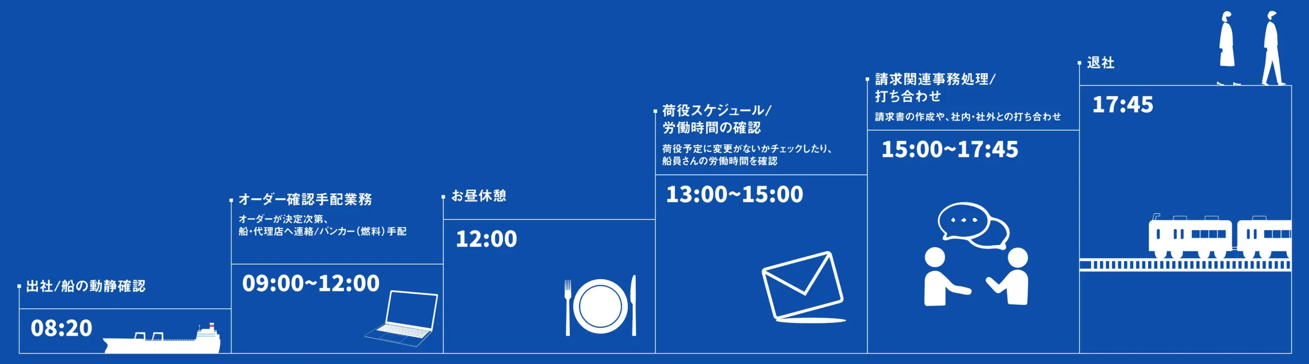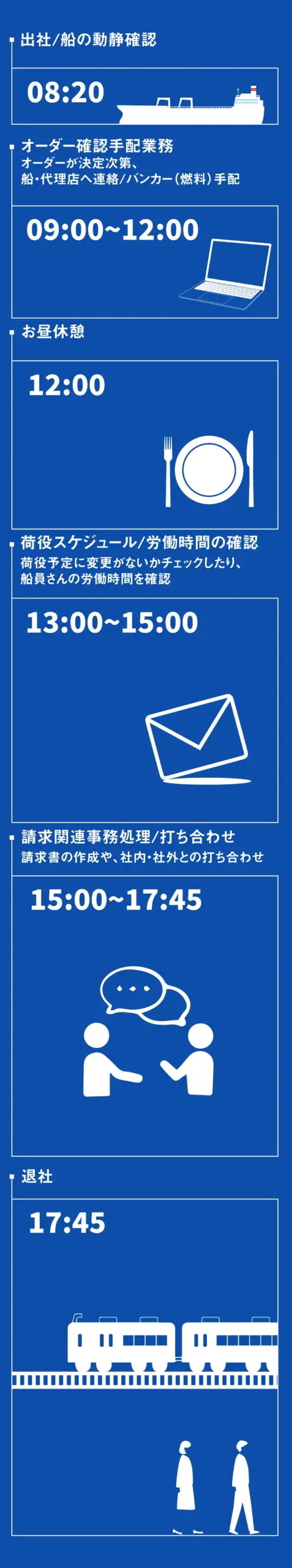 内航グループに異動したての頃は、こんなにも違うものかと戸惑いました。外航船は比較的航海時間が長いのに対し、内航船は航海時間も短く積み日の前日にオーダーが確定するため、オーダーが確定してから短い時間で船舶・各港の代理店への連絡、燃料手配、荒天であれば避難予定の確認、労働時間の確認が必要で非常にスピード感があるのが印象的でした。業務が円滑に進むように日頃から船主さんと船と密に連絡を取り合うようにしています。